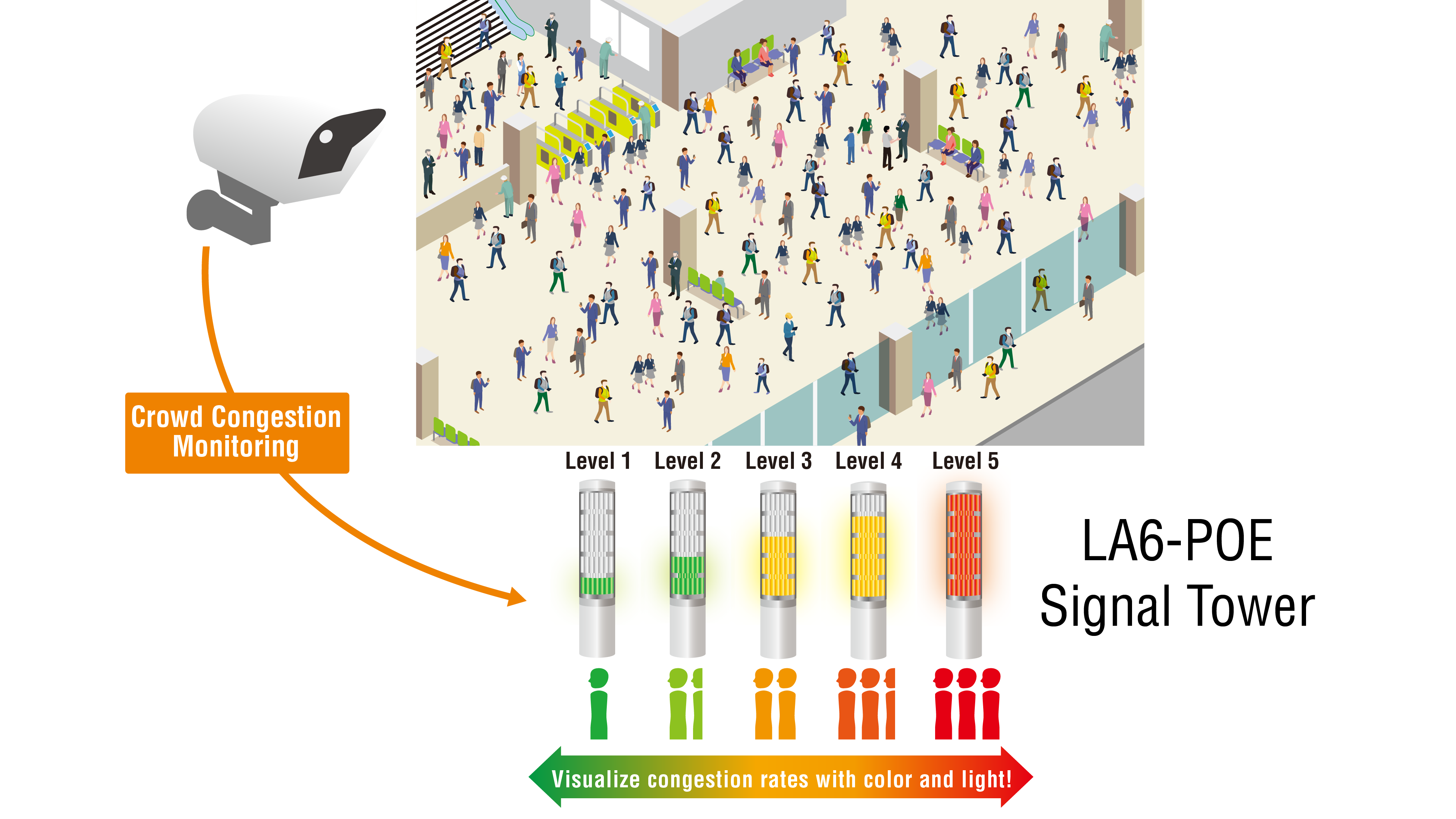 The LA6-POE, which supports HTTP command control, can display real-time congestion levels by changing its colors or stacking color tiers — enabling quick, clear visualization of crowd density.