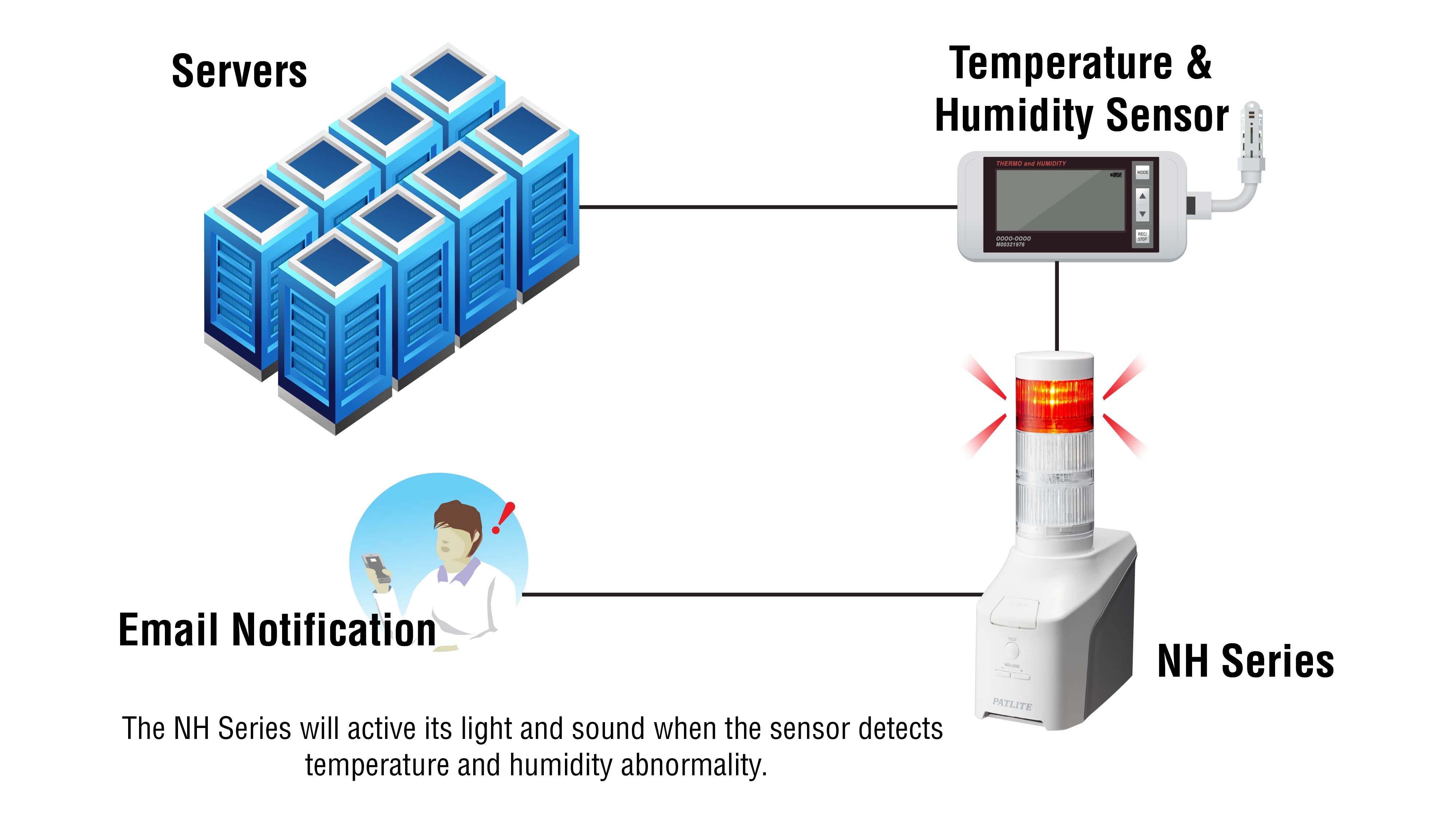 By integrating temperature and humidity sensors with the NH Series network-enabled signal towers, abnormalities are detected in real time. The system activates light and sound alarms while simultaneously sending email notifications, ensuring quick response to prevent downtime and protect critical IT infrastructure.