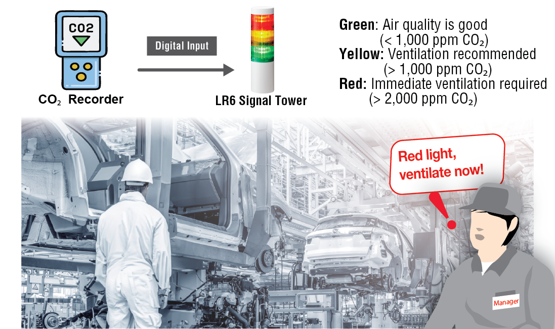 By installing LR6 Signal Tower, ambient air quality can be monitored continuously. The system uses an easy-to-understand light signal: