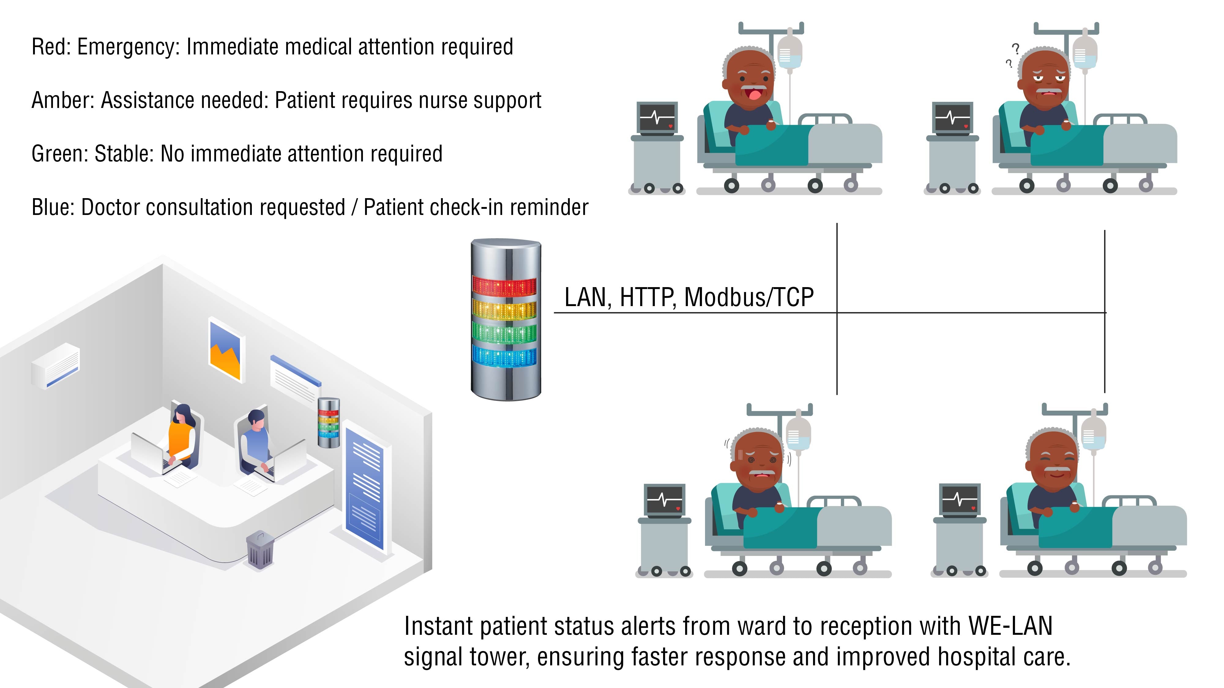 This can impact response times and patient care quality. Solution: By using the WE-LAN Series signal tower, patient status alerts are instantly communicated from the ward to the reception desk via LAN. This ensures receptionists are immediately notified when a patient requires attention, improving efficiency and timely response.