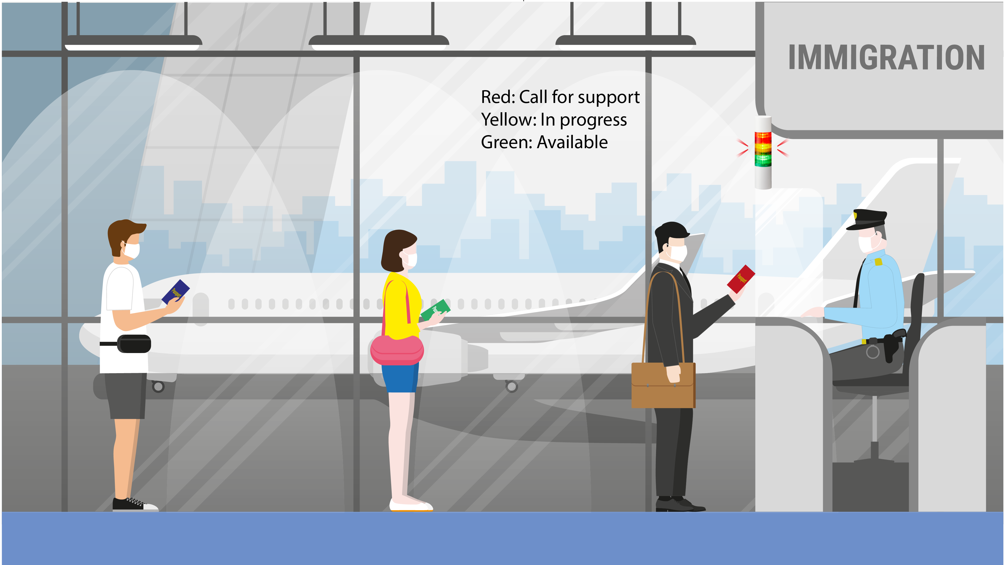 PATLITE’s LR6 Signal Tower Light is installed at each immigration counter to provide a clear visual indication of the officer’s status: